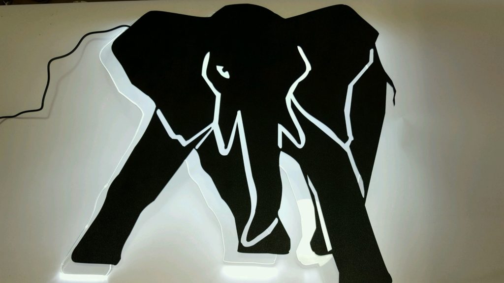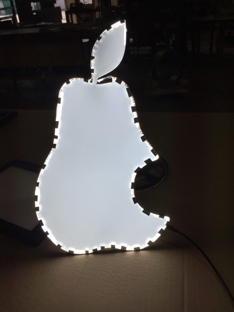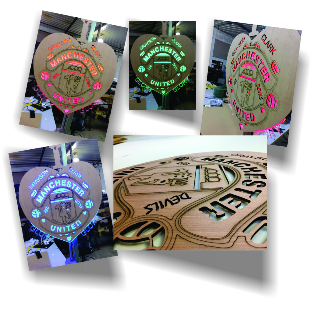 Laser-cut wood with illuminated light guide and oscillating LED’s for signage (great gifts and logos)