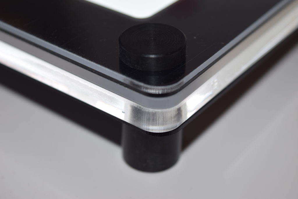 Laser-cut and LED edge-lit acrylic with Black ABS laser-cut face with wood base