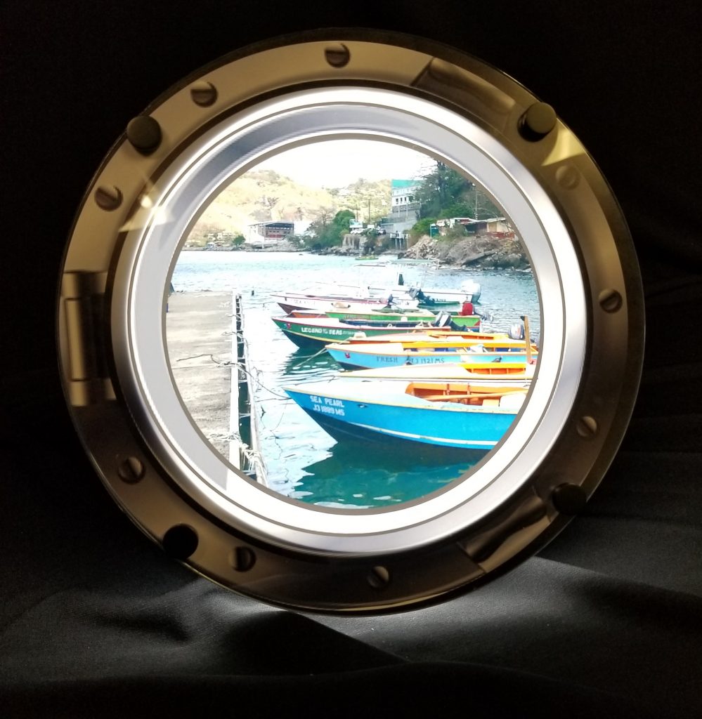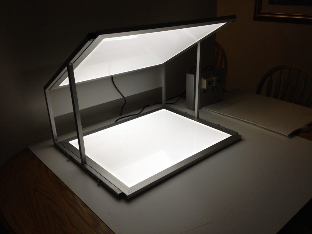 Laser-cut wood, LED edge-lit, acrylic light guide w/ laser-cut acrylic detail